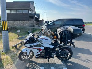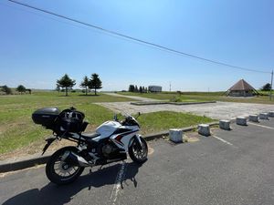 オロロンラインにある休憩所?(駐車場)にバイクを止めて、日陰でセコマで買ったアイスとメロンソーダを食べる