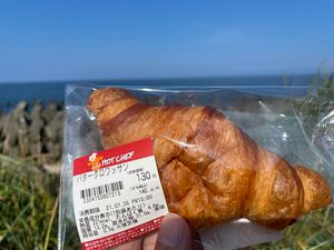 - セコマで買った"北海道牛乳モナカ"と"バタークロワッサン"を道端で食べる