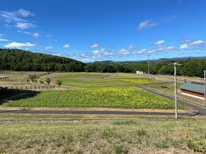 - 菜の花を眺めながらセコマで買った朝食を食べる
