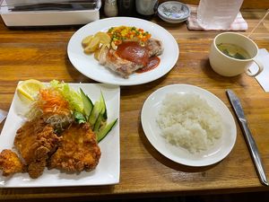 - ポークチャップとフライドチキン 1,350円 を注文。ご飯は半分にして貰った。