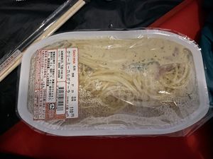 - 100円パスタは、大好きな"キンたっぷりペペロンチーノ"がなかったので"クリーミーカルボナーラ"。その名の通りクリーミーで牛乳の味がする。まぁカルボナーラだしね。