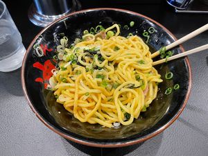 - どんぶりの底にあるごま油とラー油、酢を好みでかける
