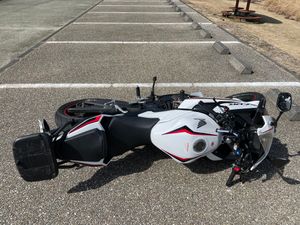 - 一人ではバイクを起こせず、自転車乗りの人に手伝って貰って起こした
