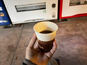 - コーヒーで暖まりながら雨宿りするも屋外なので寒い