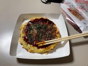 - 糸川のセブンイレブンで買ったお好み焼きを宿で食べる