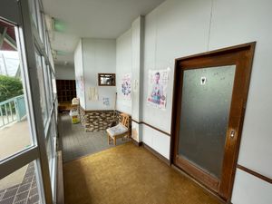 - 番台があり、男女の入り口と脱衣所が見える