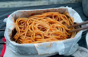 - 味噌汁, 魚肉ソーセージ, パスタ + ミートソース