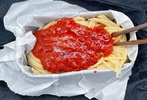 - 味噌汁, 魚肉ソーセージ, パスタ アラビアータ