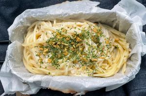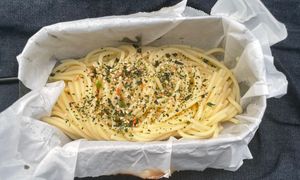- 味噌汁, 魚肉ソーセージ, パスタ ガーリックマヨ
