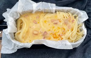 - 味噌汁, 魚肉ソーセージ, パスタ カルボナーラ