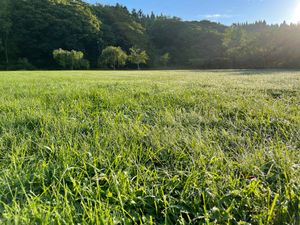 朝露に濡れた草が太陽に照らされて白く輝いて見える