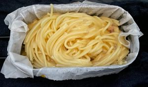 - 味噌汁, 魚肉ソーセージ, パスタ カルボナーラ