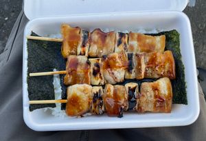 - ねぎま(豚肉)x3, 海苔, ご飯